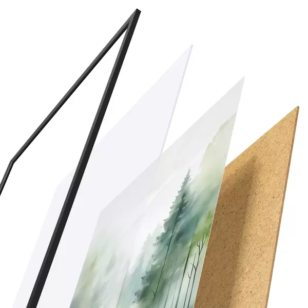 De poster bestaat uit een frame, plexiglas, geprinte afbeelding en spaanplaat achterkant. De poster kan meteen aan de muur worden gehangen dankzij de bevestigingen op de achterkant.