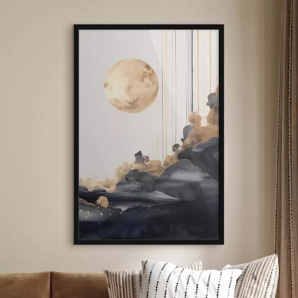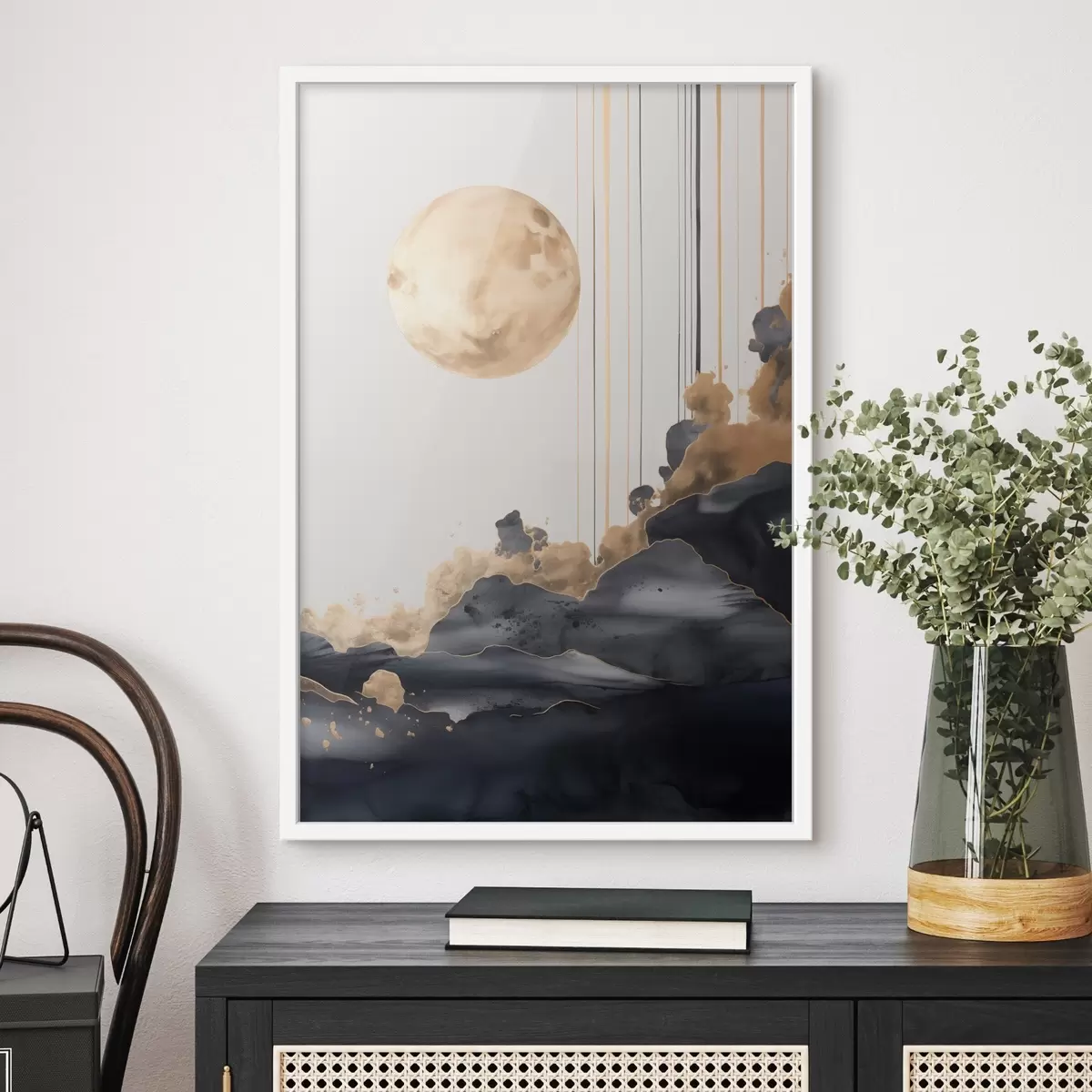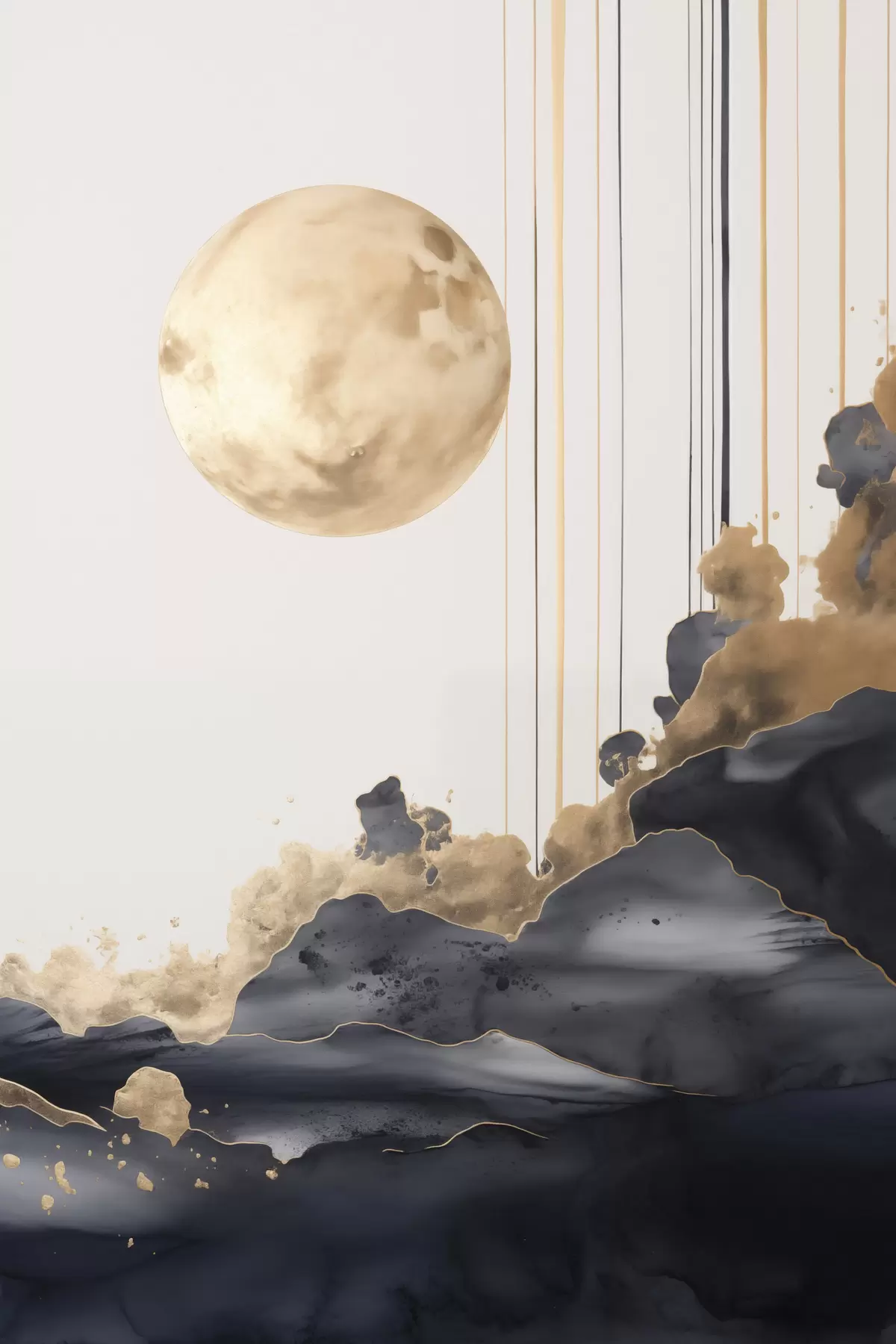 Poster Een volle maan met zwarte en gestructureerde gele wolken, verticale lijnen, abstracte stijl, minimalistisch en modern Nr f46707