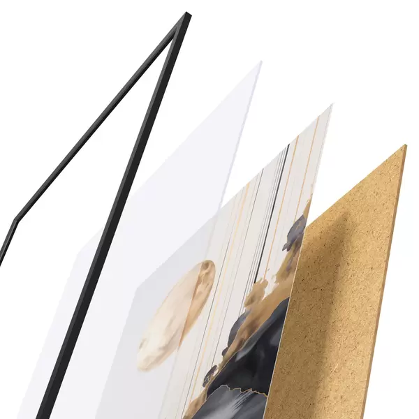 De poster bestaat uit een frame, plexiglas, geprinte afbeelding en spaanplaat achterkant. De poster kan meteen aan de muur worden gehangen dankzij de bevestigingen op de achterkant.