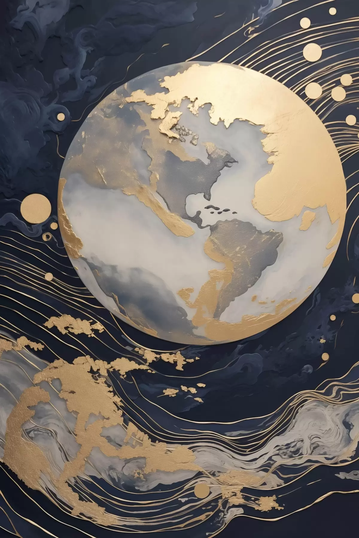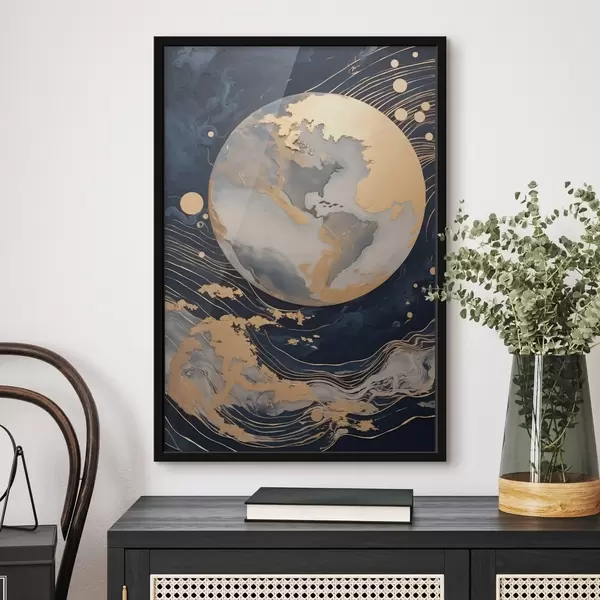 Poster Getextureerde decoratieve planeet met gele lijnen op de achtergrond, gele stippen op de achtergrond, donkere achtergrond Nr f46708
