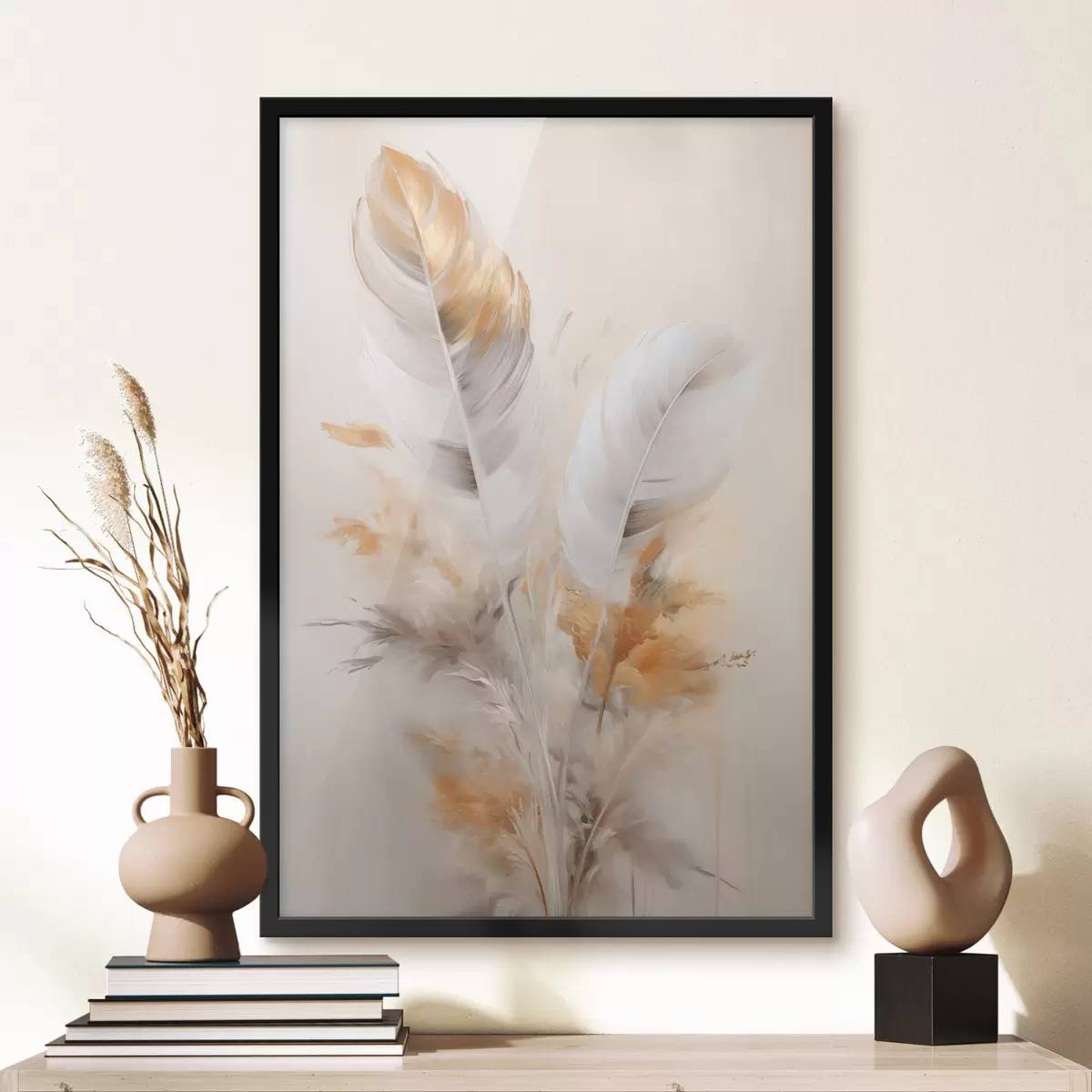 Poster Abstracte veren, omgeven door beige en bruine pluimen, zacht en delicaat, op een lichtbeige achtergrond Nr f46711