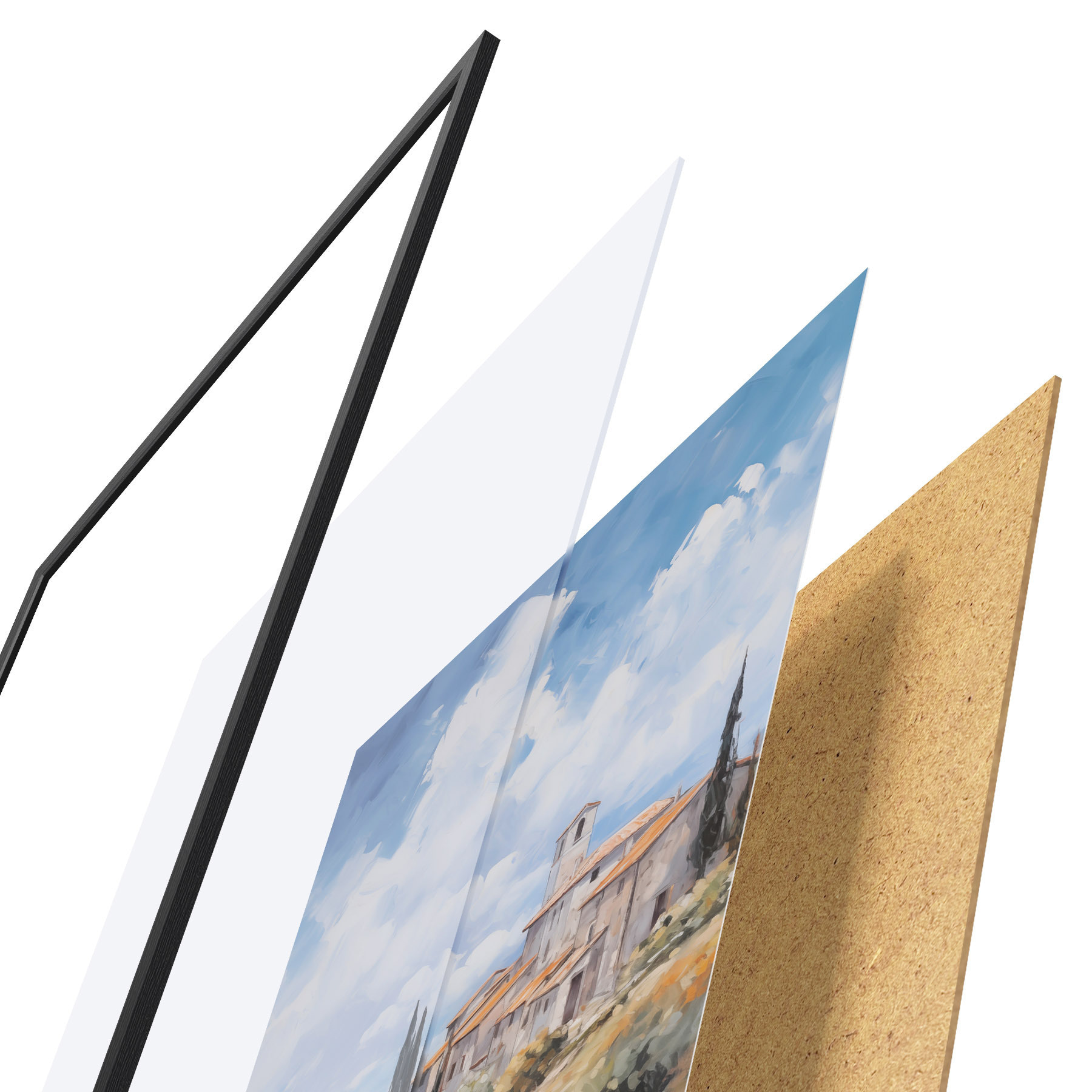 De poster bestaat uit een frame, plexiglas, geprinte afbeelding en spaanplaat achterkant. De poster kan meteen aan de muur worden gehangen dankzij de bevestigingen op de achterkant.