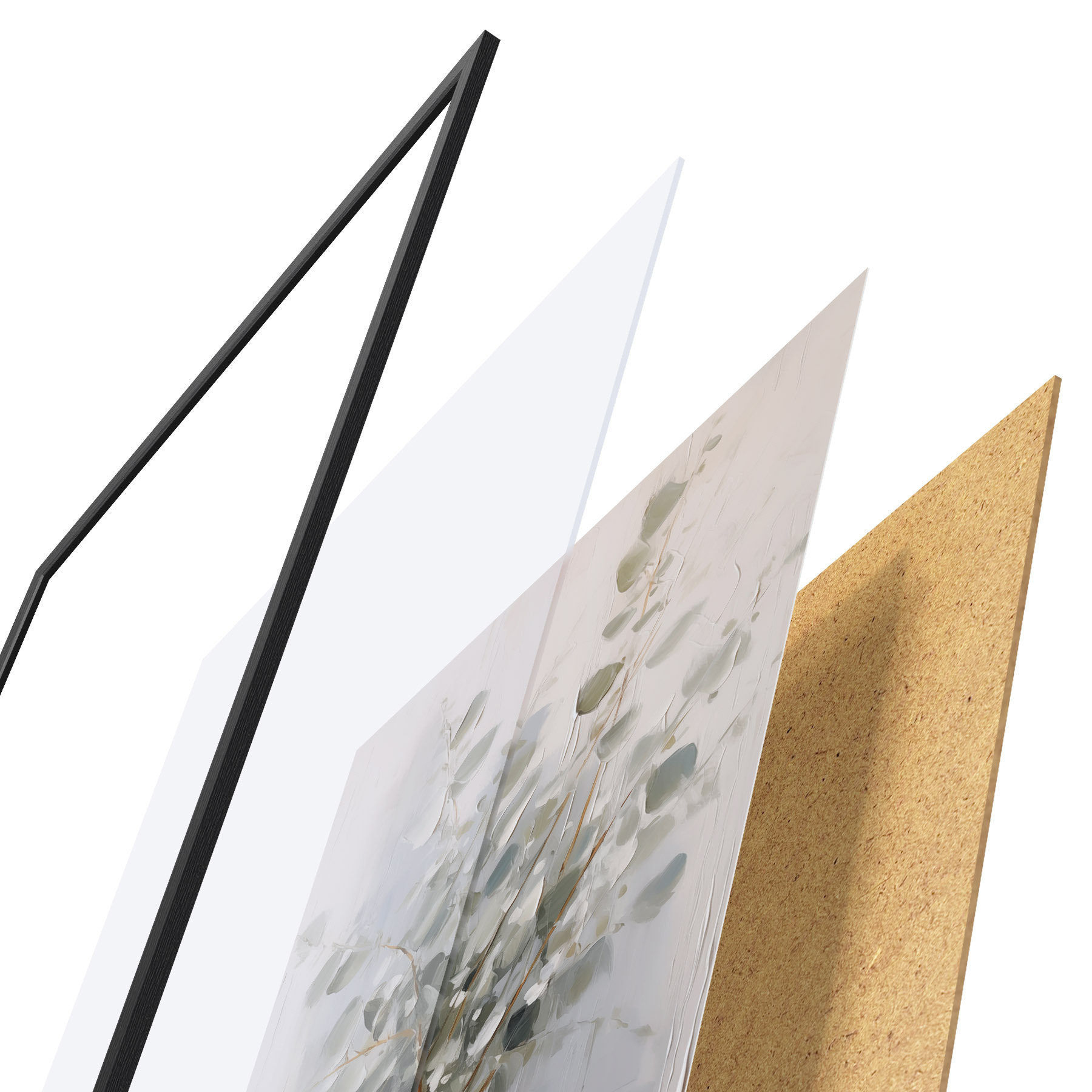 De poster bestaat uit een frame, plexiglas, geprinte afbeelding en spaanplaat achterkant. De poster kan meteen aan de muur worden gehangen dankzij de bevestigingen op de achterkant.