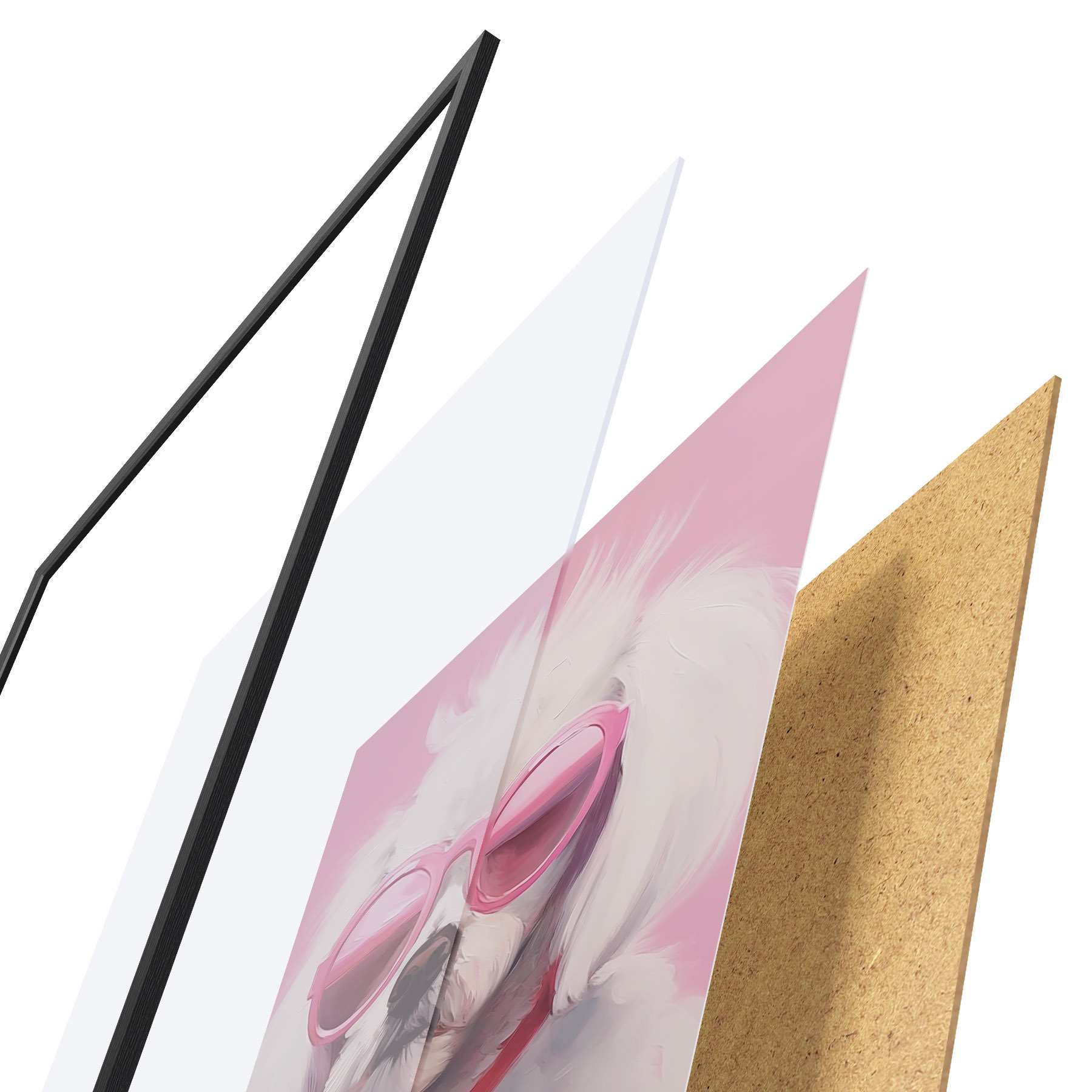 De poster bestaat uit een frame, plexiglas, geprinte afbeelding en spaanplaat achterkant. De poster kan meteen aan de muur worden gehangen dankzij de bevestigingen op de achterkant.