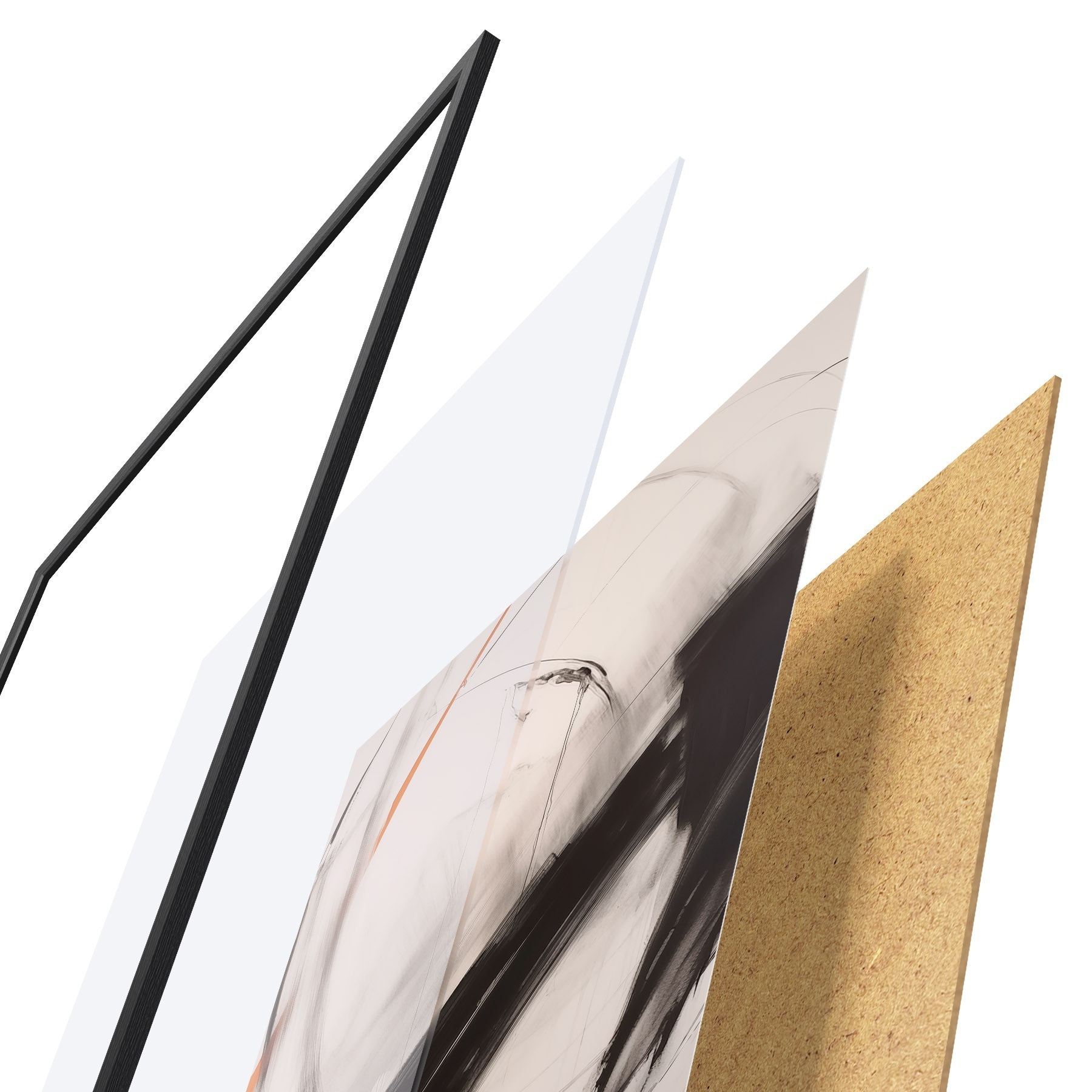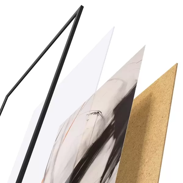 De poster bestaat uit een frame, plexiglas, geprinte afbeelding en spaanplaat achterkant. De poster kan meteen aan de muur worden gehangen dankzij de bevestigingen op de achterkant.