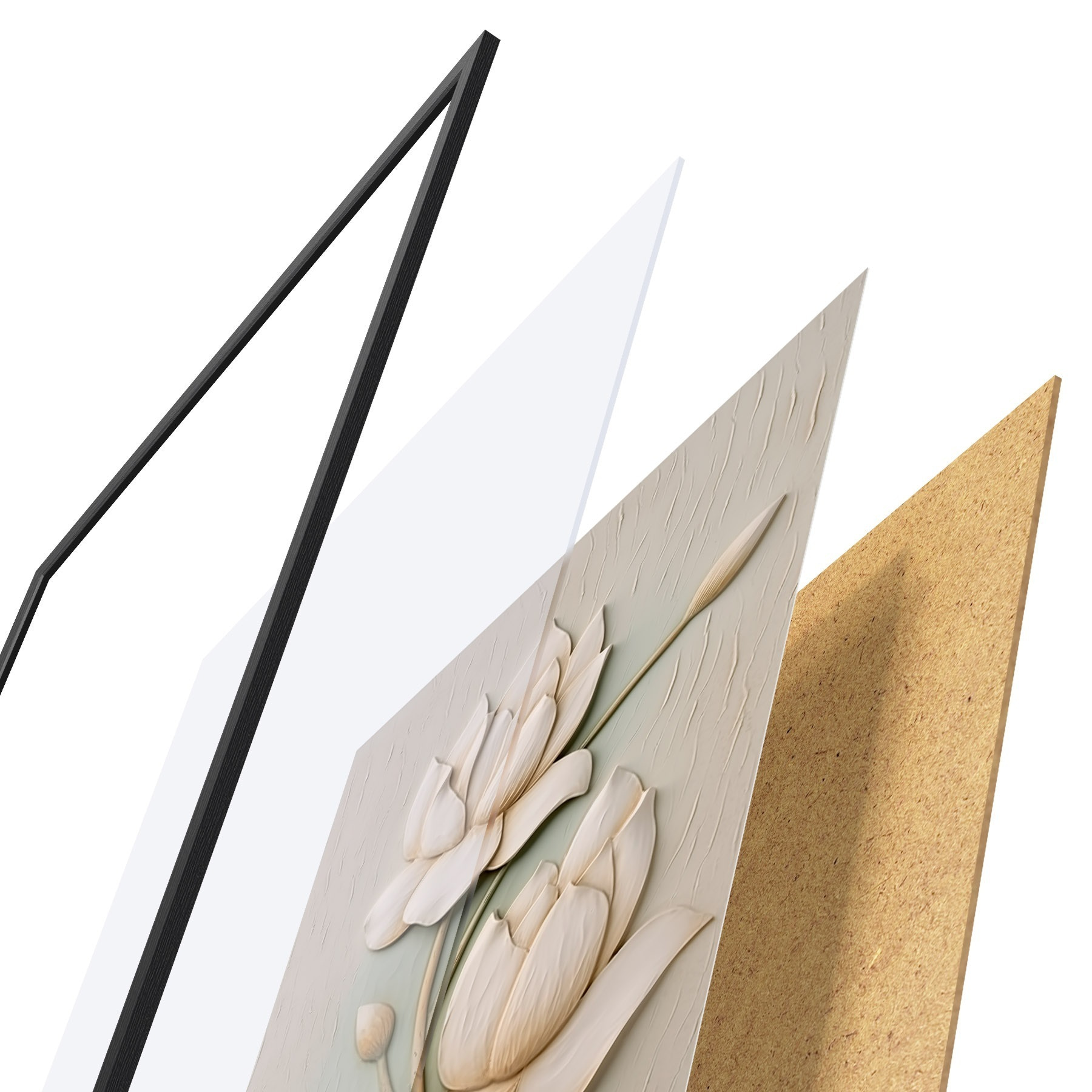 De poster bestaat uit een frame, plexiglas, geprinte afbeelding en spaanplaat achterkant. De poster kan meteen aan de muur worden gehangen dankzij de bevestigingen op de achterkant.