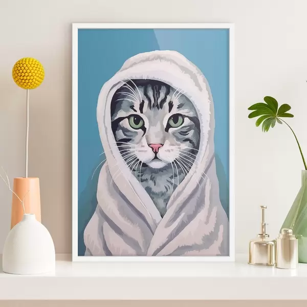 Poster Gestreepte kat in een witte handdoek Nr f46740