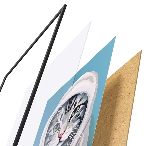 De poster bestaat uit een frame, plexiglas, geprinte afbeelding en spaanplaat achterkant. De poster kan meteen aan de muur worden gehangen dankzij de bevestigingen op de achterkant.