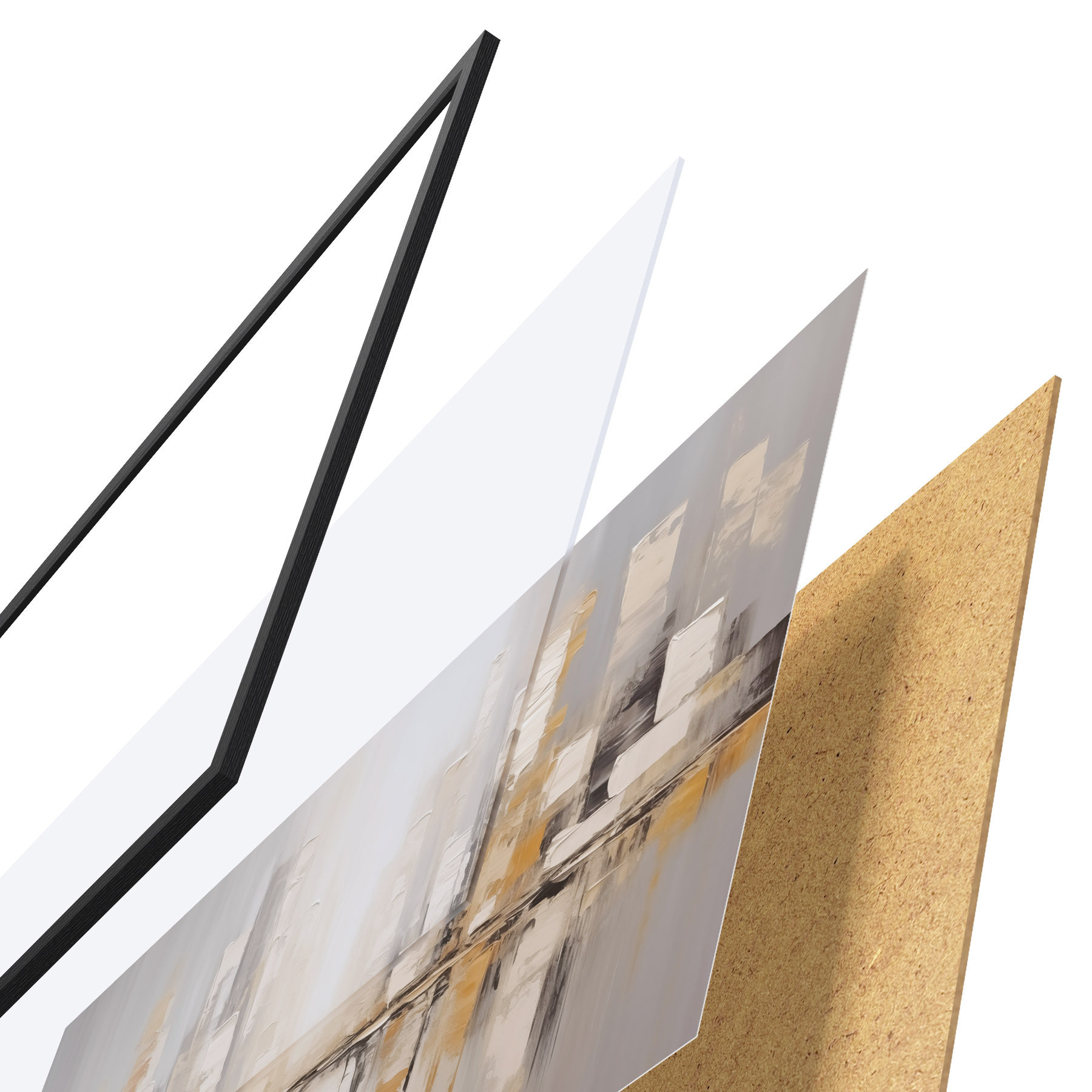 De poster bestaat uit een frame, plexiglas, geprinte afbeelding en spaanplaat achterkant. De poster kan meteen aan de muur worden gehangen dankzij de bevestigingen op de achterkant.