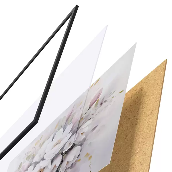 De poster bestaat uit een frame, plexiglas, geprinte afbeelding en spaanplaat achterkant. De poster kan meteen aan de muur worden gehangen dankzij de bevestigingen op de achterkant.