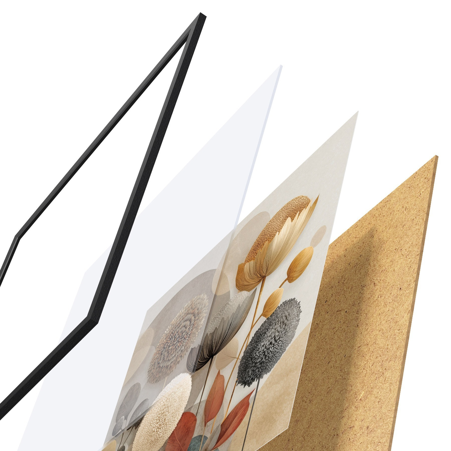 De poster bestaat uit een frame, plexiglas, geprinte afbeelding en spaanplaat achterkant. De poster kan meteen aan de muur worden gehangen dankzij de bevestigingen op de achterkant.