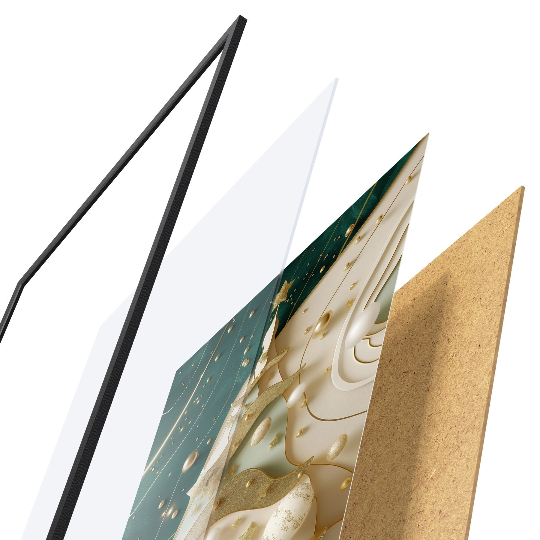 De poster bestaat uit een frame, plexiglas, geprinte afbeelding en spaanplaat achterkant. De poster kan meteen aan de muur worden gehangen dankzij de bevestigingen op de achterkant.
