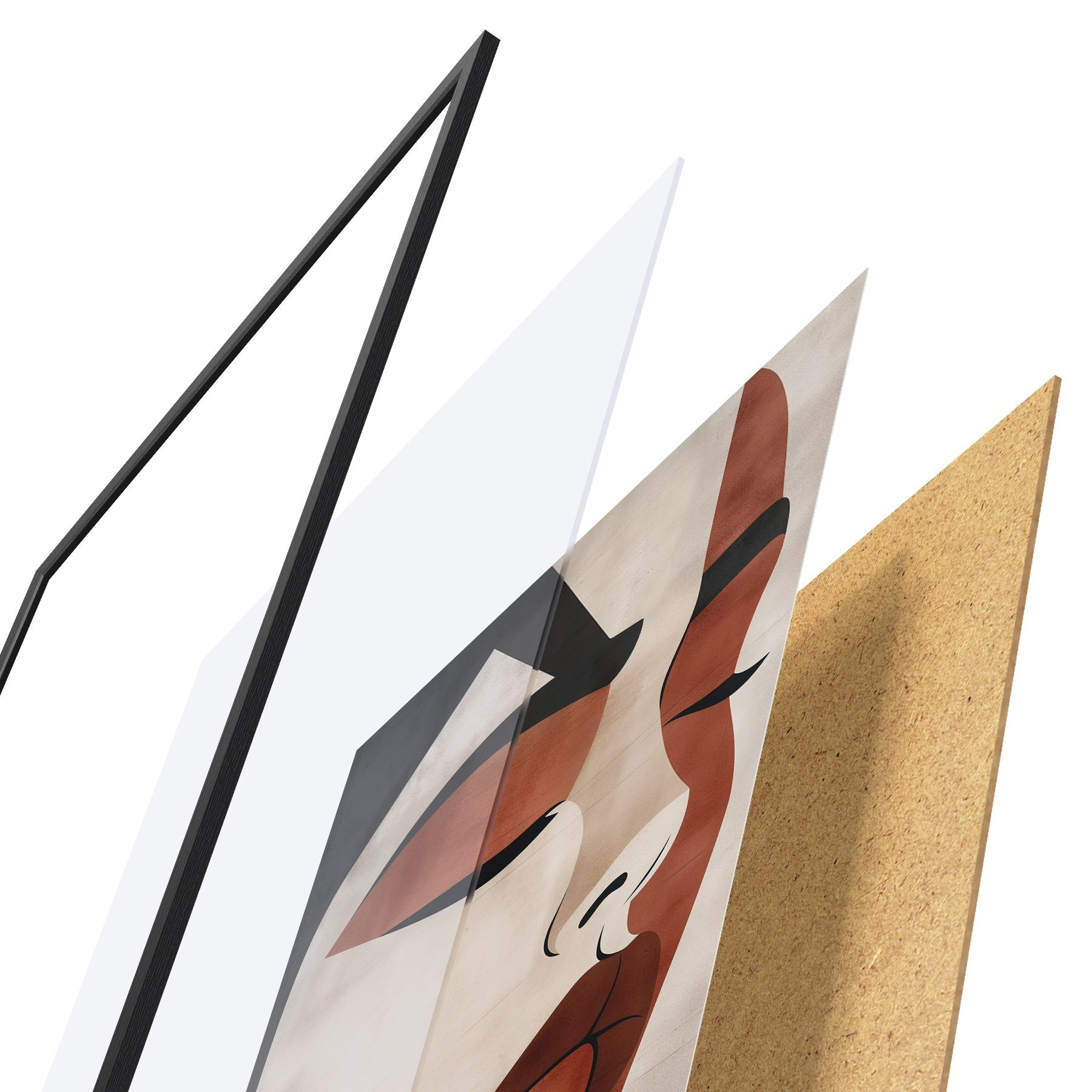 De poster bestaat uit een frame, plexiglas, geprinte afbeelding en spaanplaat achterkant. De poster kan meteen aan de muur worden gehangen dankzij de bevestigingen op de achterkant.