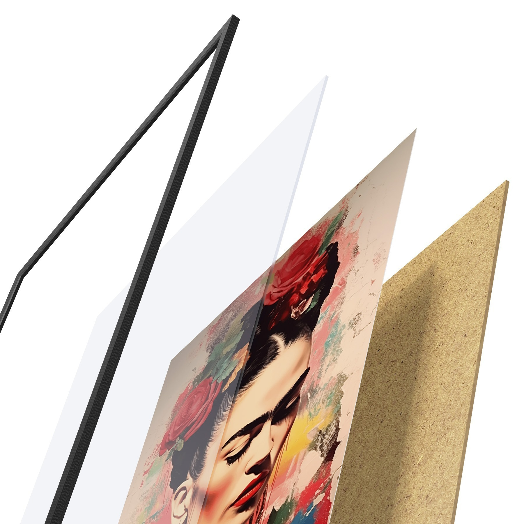 De poster bestaat uit een frame, plexiglas, geprinte afbeelding en spaanplaat achterkant. De poster kan meteen aan de muur worden gehangen dankzij de bevestigingen op de achterkant.