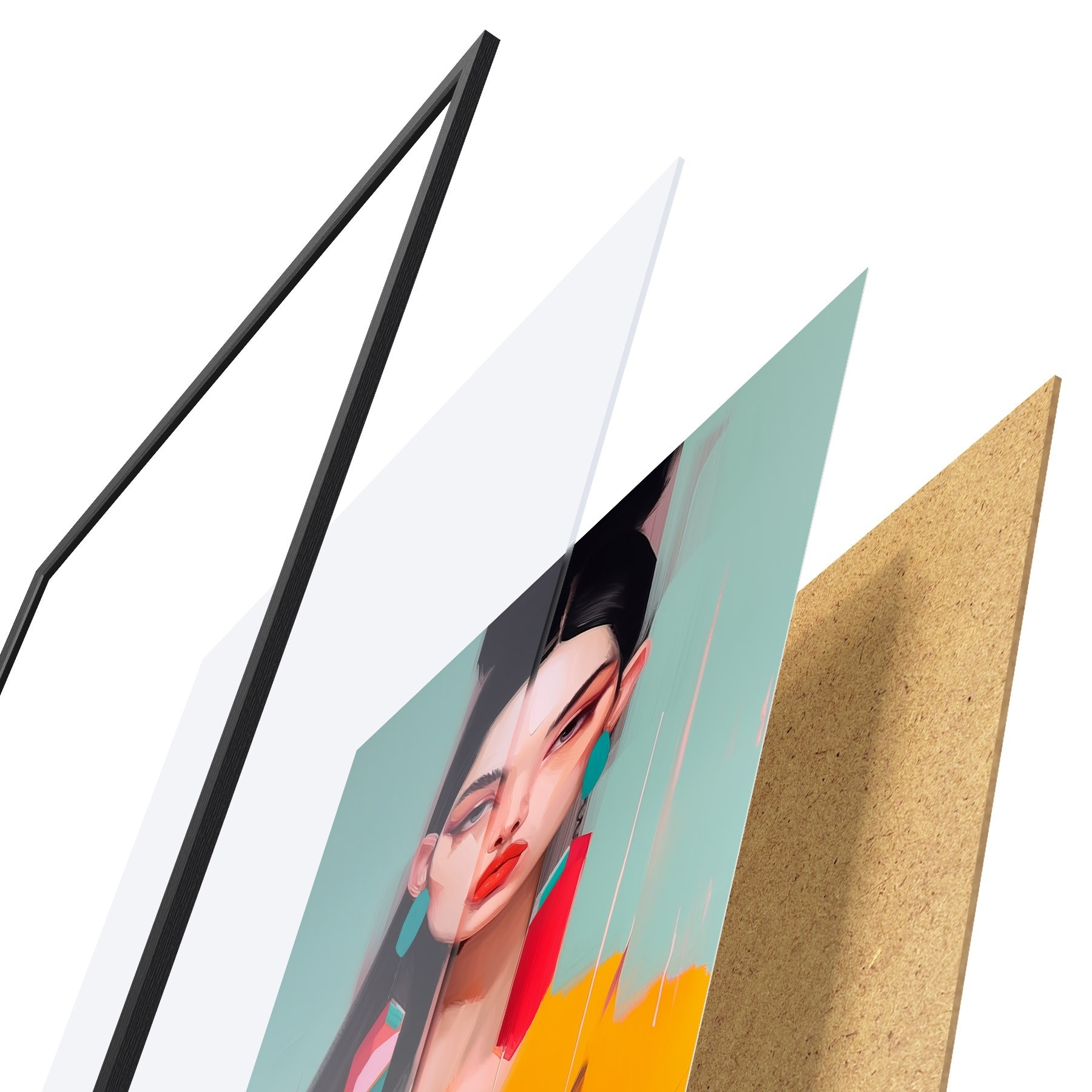 De poster bestaat uit een frame, plexiglas, geprinte afbeelding en spaanplaat achterkant. De poster kan meteen aan de muur worden gehangen dankzij de bevestigingen op de achterkant.