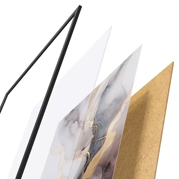 De poster bestaat uit een frame, plexiglas, geprinte afbeelding en spaanplaat achterkant. De poster kan meteen aan de muur worden gehangen dankzij de bevestigingen op de achterkant.