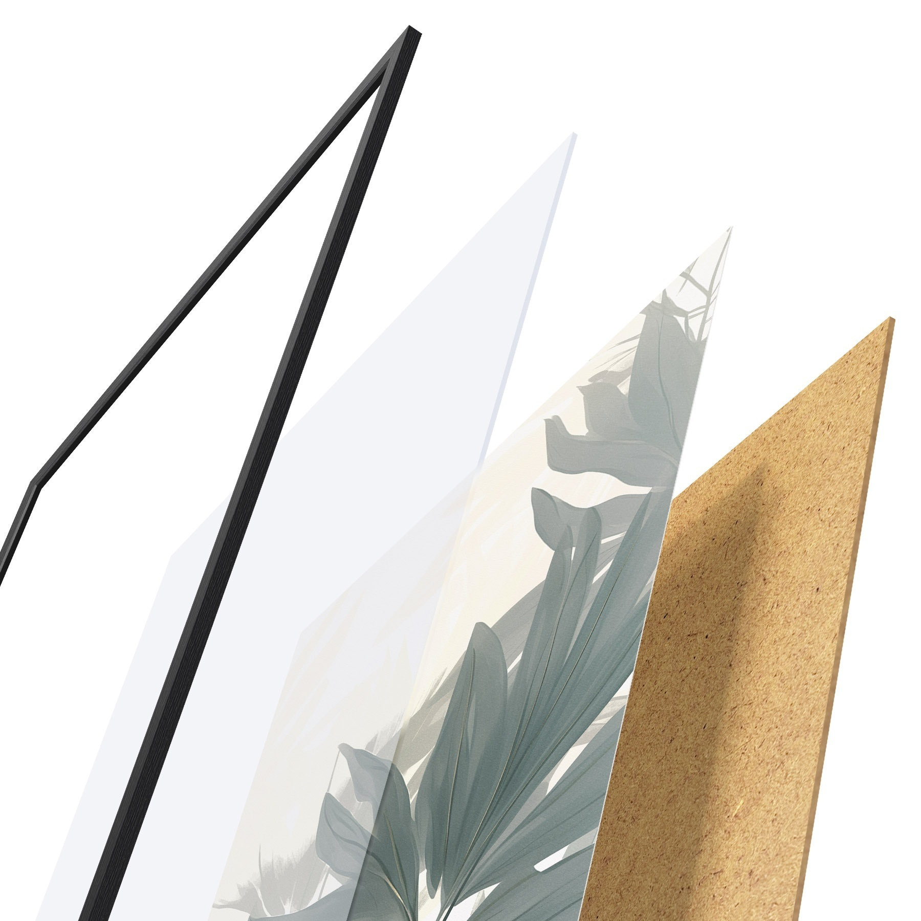 De poster bestaat uit een frame, plexiglas, geprinte afbeelding en spaanplaat achterkant. De poster kan meteen aan de muur worden gehangen dankzij de bevestigingen op de achterkant.