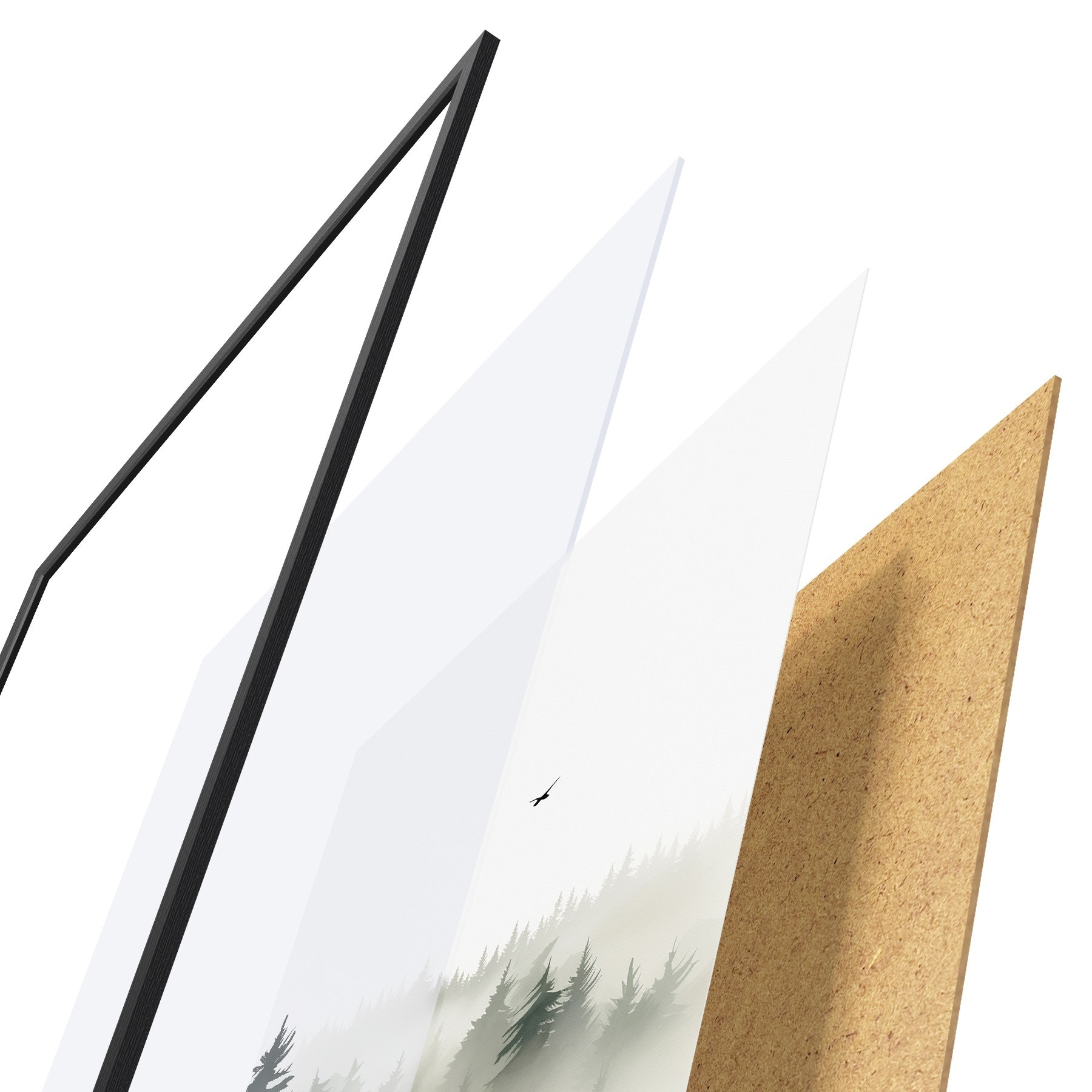 De poster bestaat uit een frame, plexiglas, geprinte afbeelding en spaanplaat achterkant. De poster kan meteen aan de muur worden gehangen dankzij de bevestigingen op de achterkant.