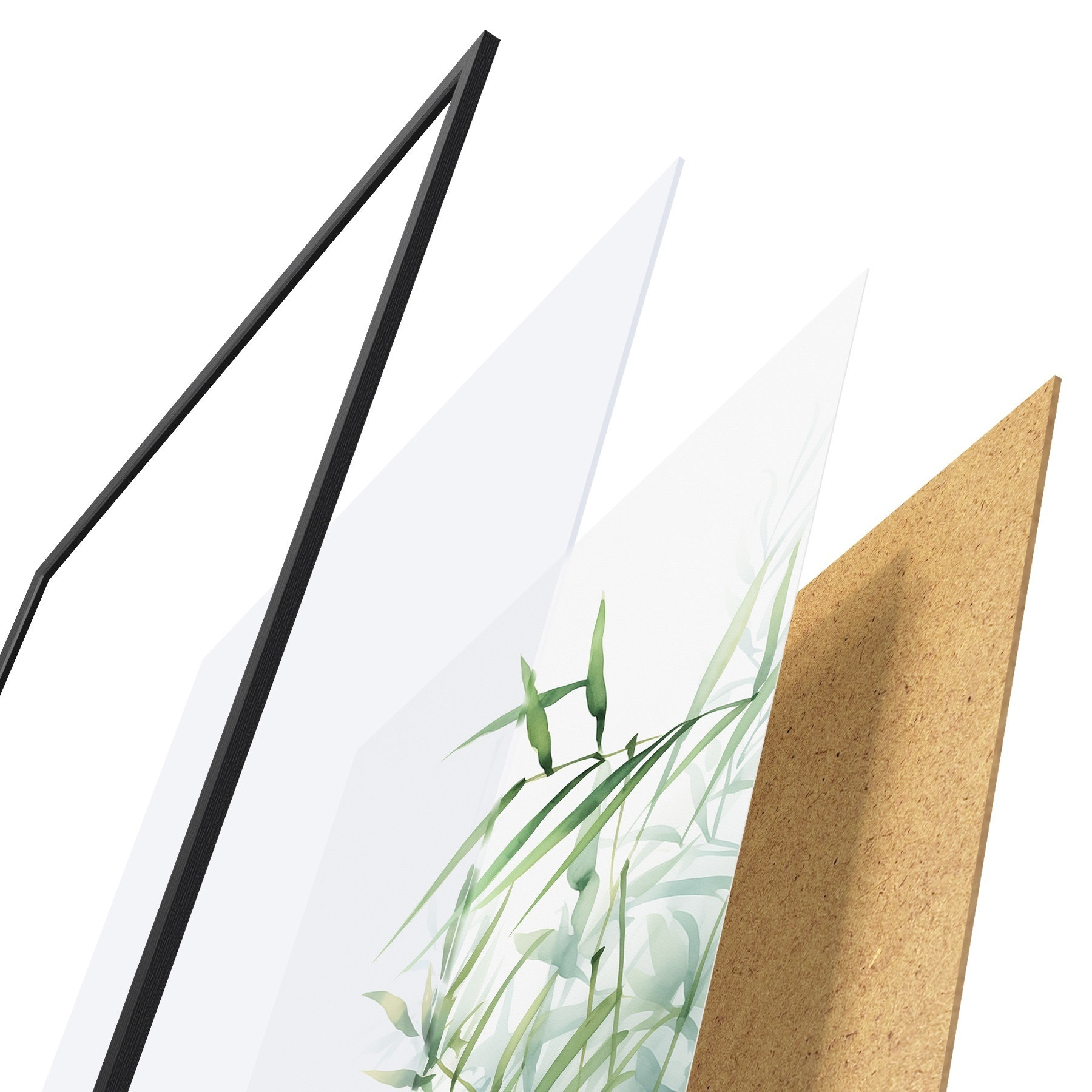 De poster bestaat uit een frame, plexiglas, geprinte afbeelding en spaanplaat achterkant. De poster kan meteen aan de muur worden gehangen dankzij de bevestigingen op de achterkant.