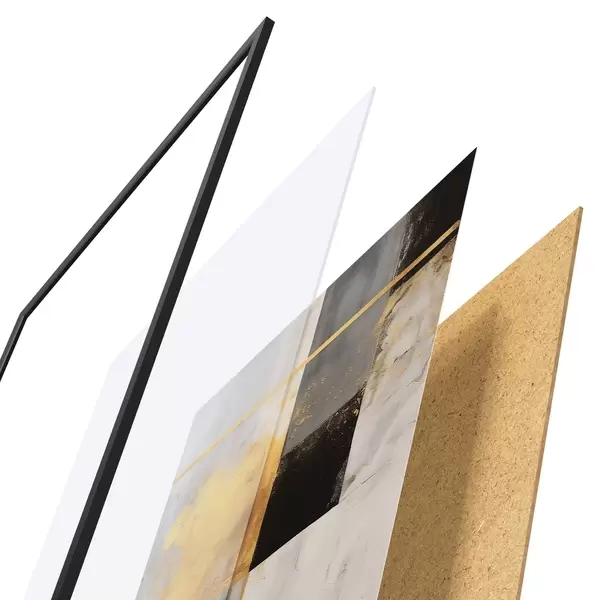De poster bestaat uit een frame, plexiglas, geprinte afbeelding en spaanplaat achterkant. De poster kan meteen aan de muur worden gehangen dankzij de bevestigingen op de achterkant.