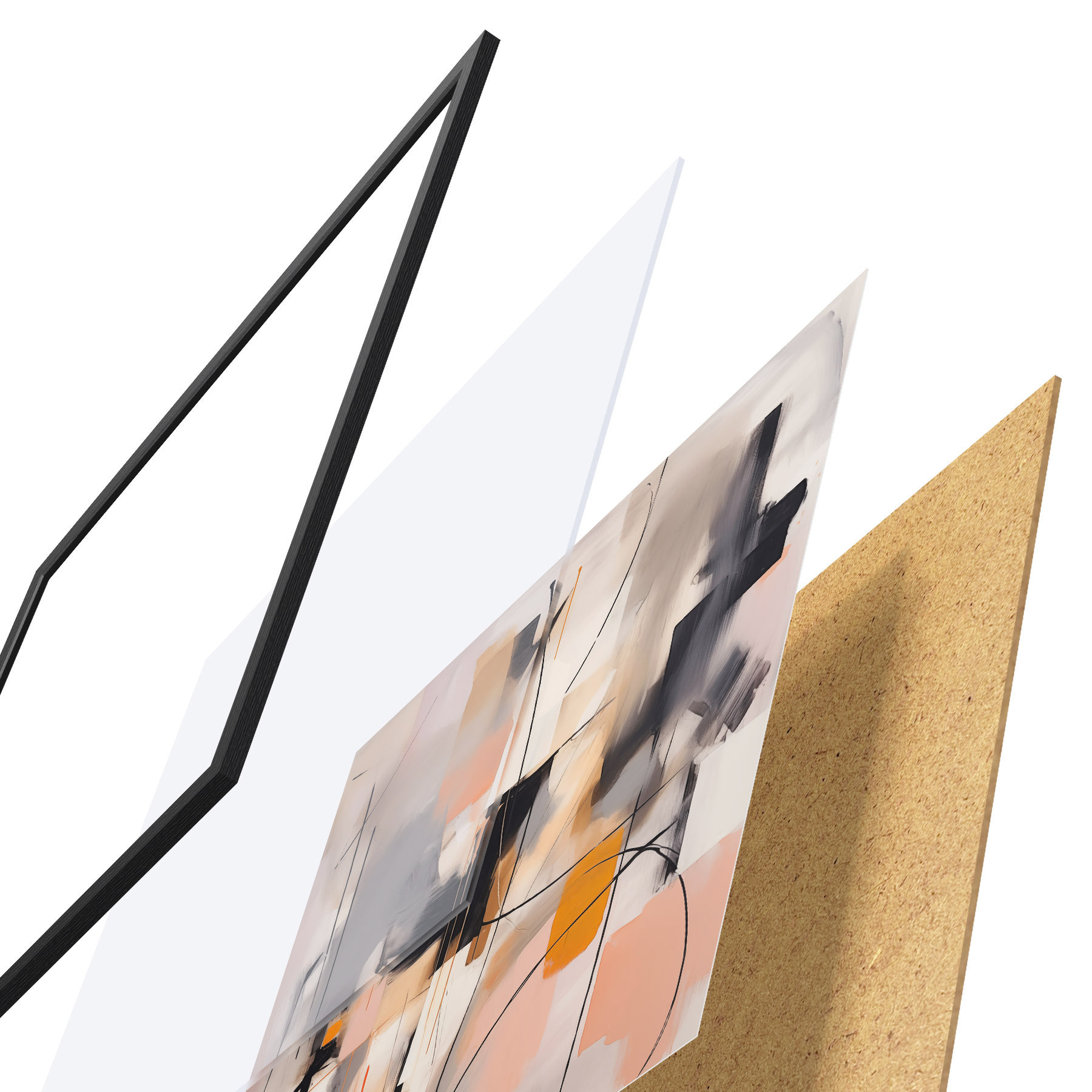 De poster bestaat uit een frame, plexiglas, geprinte afbeelding en spaanplaat achterkant. De poster kan meteen aan de muur worden gehangen dankzij de bevestigingen op de achterkant.