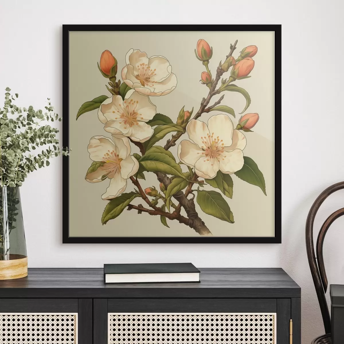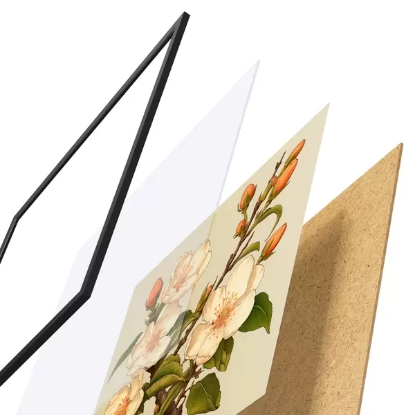 Poster Bloeiende tak met witte bloemen op een beige achtergrond in de stijl van een klassieke illustratie f46923