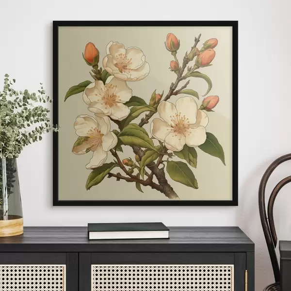 Poster Bloeiende tak met witte bloemen op een beige achtergrond in de stijl van een klassieke illustratie Nr f46923