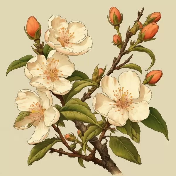 Poster Bloeiende tak met witte bloemen op een beige achtergrond in de stijl van een klassieke illustratie Nr f46923