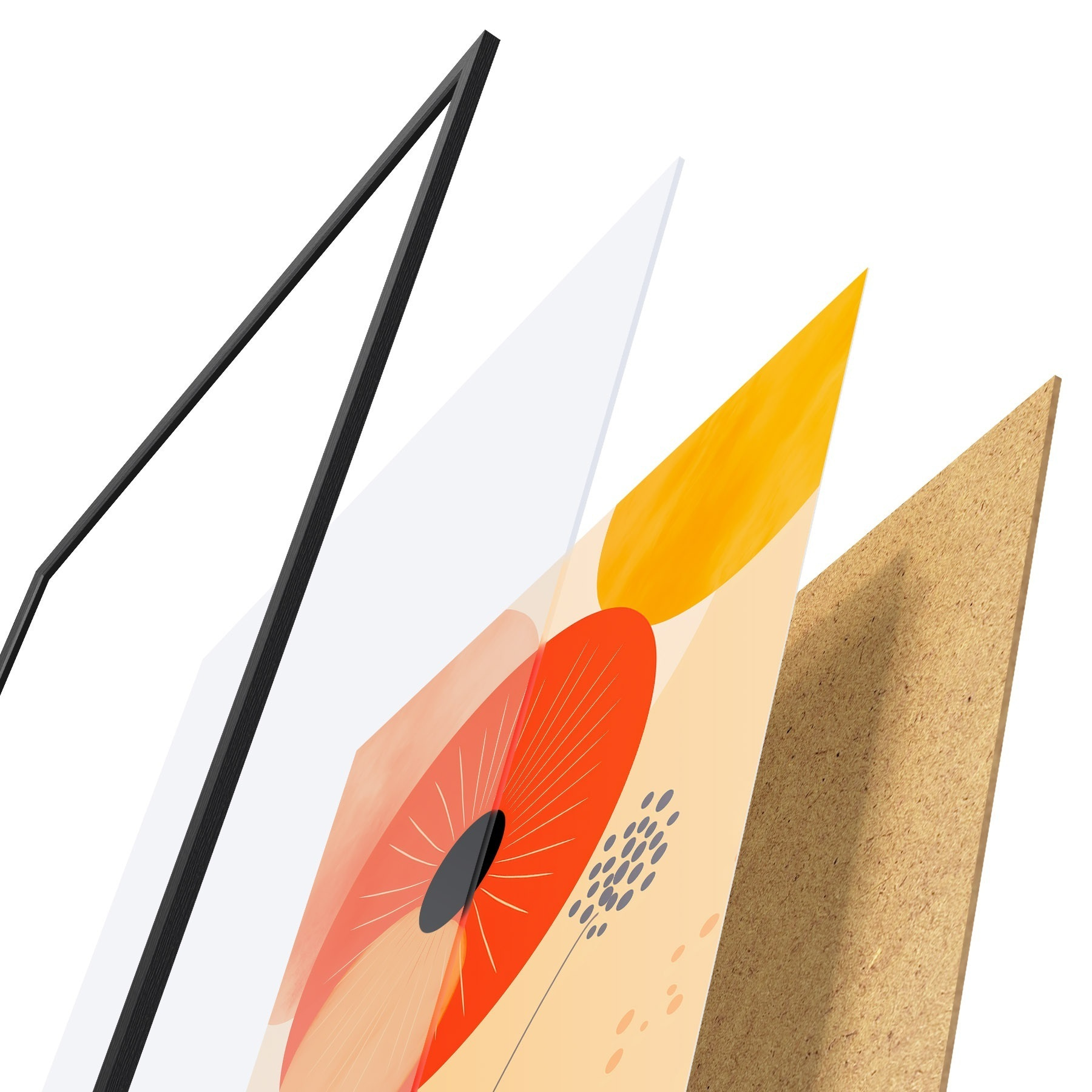 De poster bestaat uit een frame, plexiglas, geprinte afbeelding en spaanplaat achterkant. De poster kan meteen aan de muur worden gehangen dankzij de bevestigingen op de achterkant.