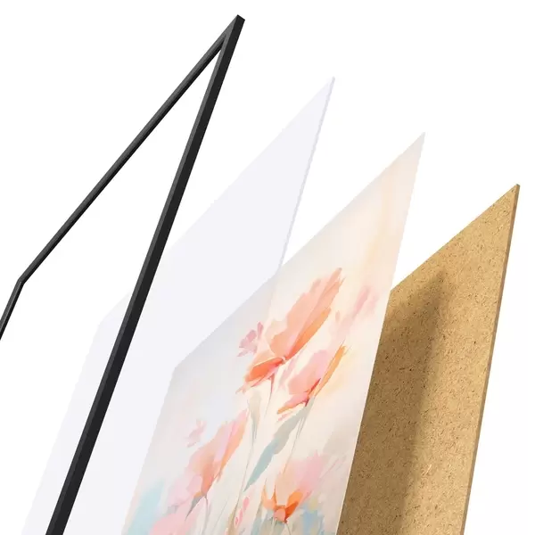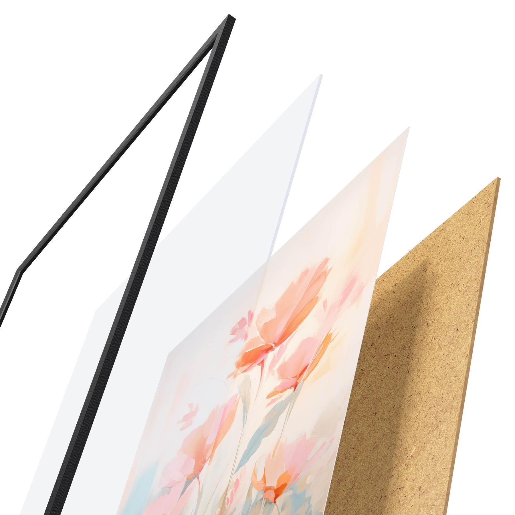 De poster bestaat uit een frame, plexiglas, geprinte afbeelding en spaanplaat achterkant. De poster kan meteen aan de muur worden gehangen dankzij de bevestigingen op de achterkant.