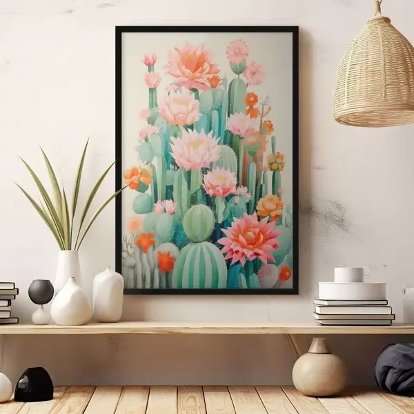 Poster Bloeiende cactussen met roze en oranje bloemen in illustratiestijl Nr f46934