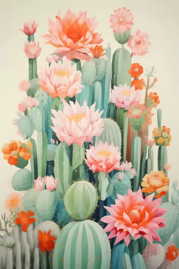 Poster Bloeiende cactussen met roze en oranje bloemen in illustratiestijl Nr f46934