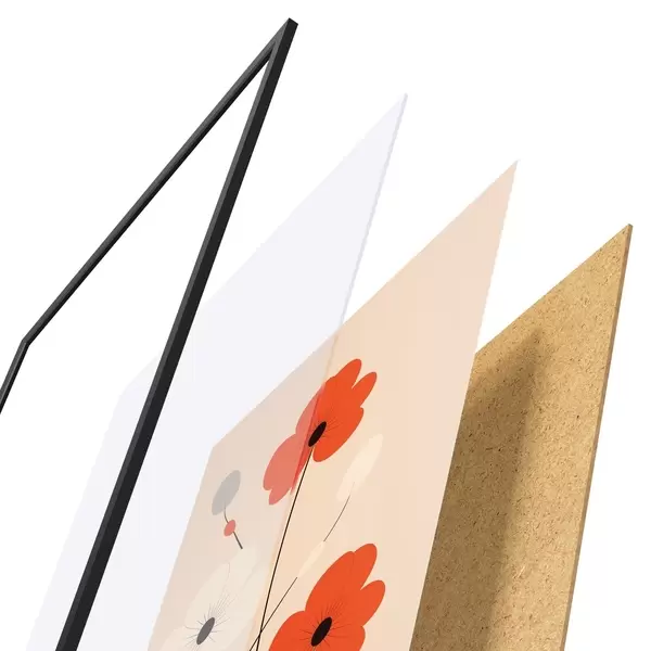 De poster bestaat uit een frame, plexiglas, geprinte afbeelding en spaanplaat achterkant. De poster kan meteen aan de muur worden gehangen dankzij de bevestigingen op de achterkant.