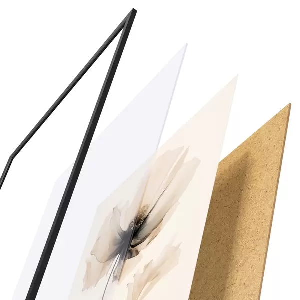 De poster bestaat uit een frame, plexiglas, geprinte afbeelding en spaanplaat achterkant. De poster kan meteen aan de muur worden gehangen dankzij de bevestigingen op de achterkant.