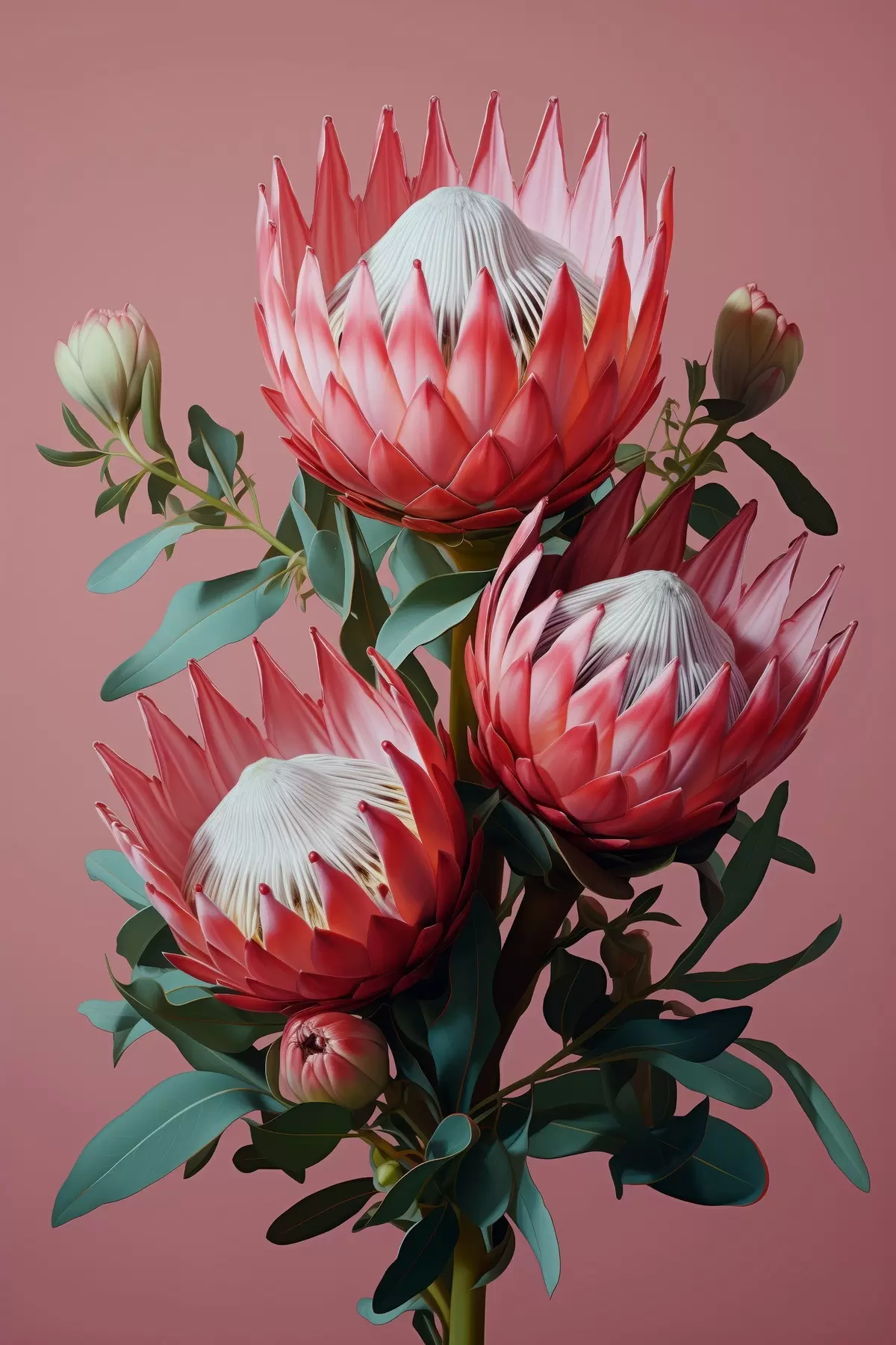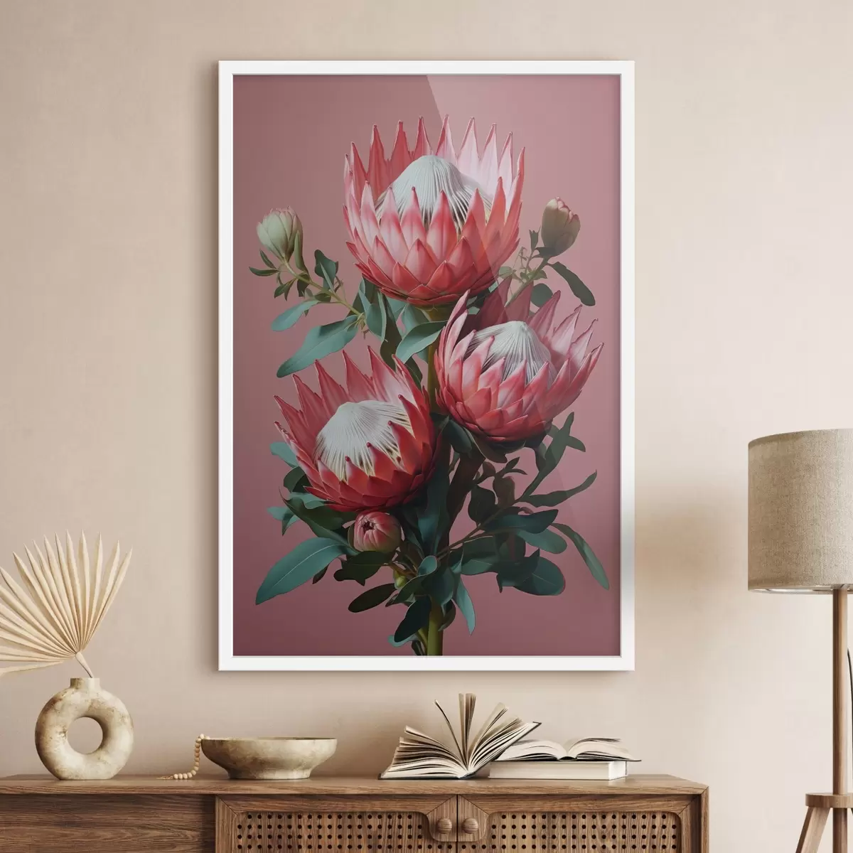 Poster Protea-boeket met rode bloemblaadjes en groen blad op een roze achtergrond f46946
