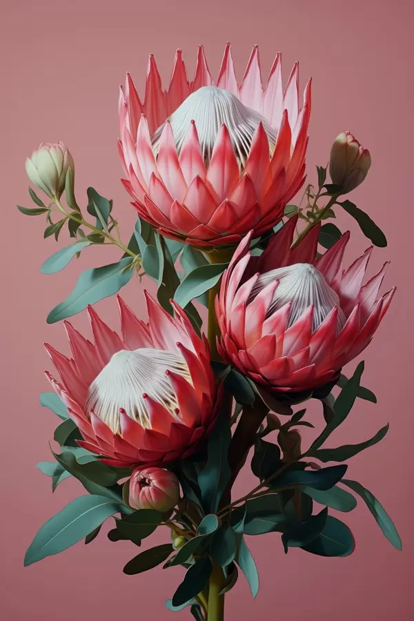 Poster Protea-boeket met rode bloemblaadjes en groen blad op een roze achtergrond Nr f46946