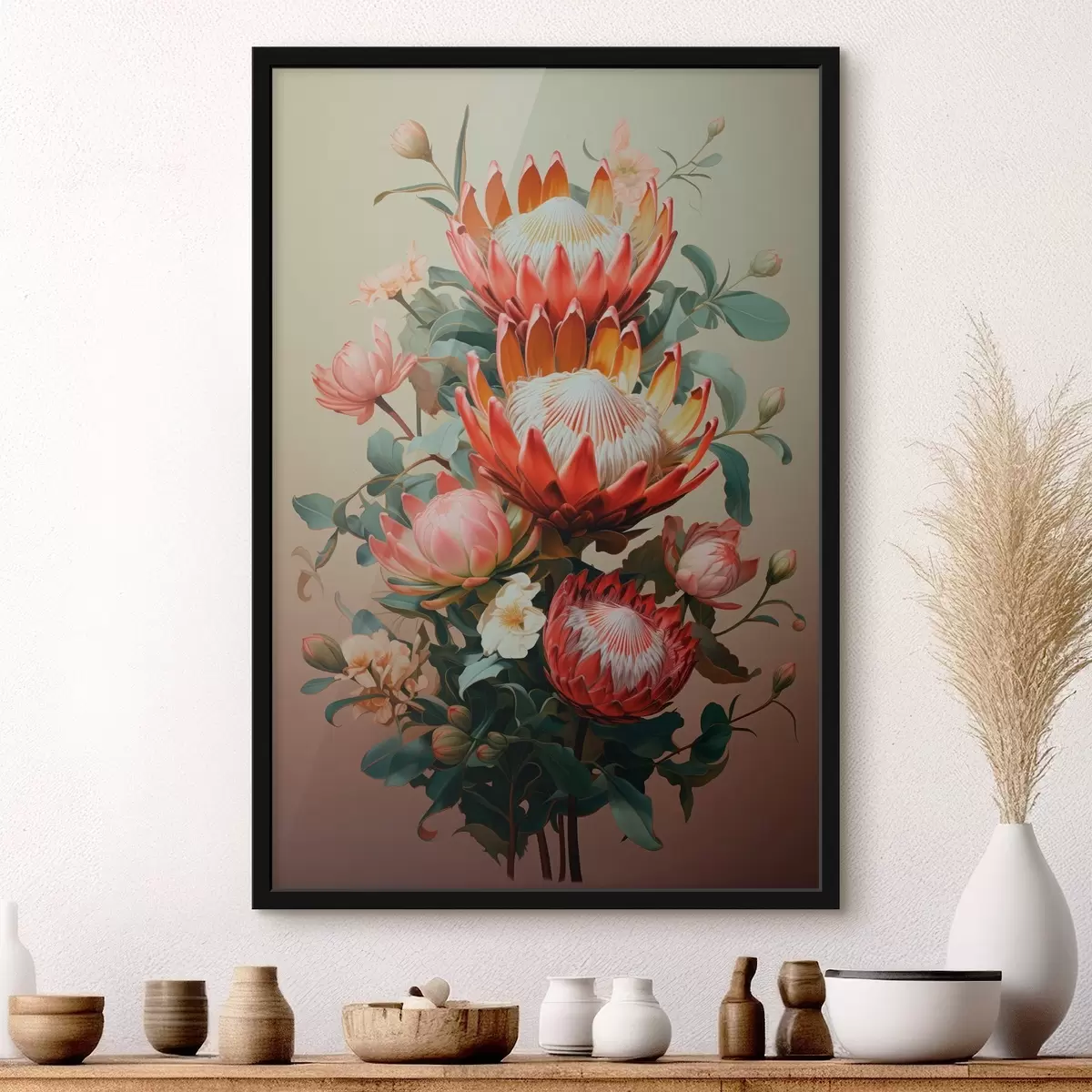 Poster Compositie met grote protea's in een moderne digitale schilderachtige illustratiestijl f46947