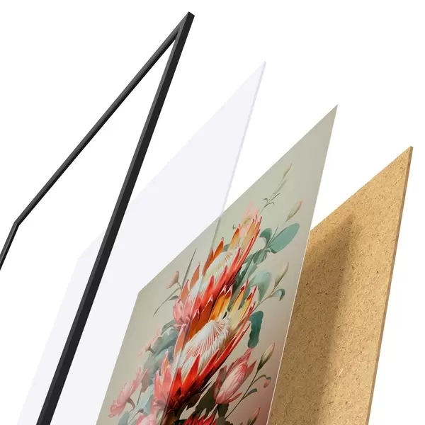 De poster bestaat uit een frame, plexiglas, geprinte afbeelding en spaanplaat achterkant. De poster kan meteen aan de muur worden gehangen dankzij de bevestigingen op de achterkant.