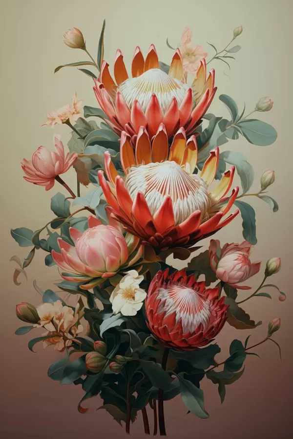 Poster Compositie met grote protea's in een moderne digitale schilderachtige illustratiestijl f46947