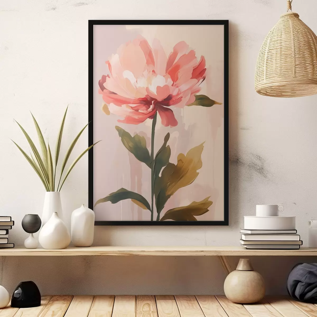 Poster Pioenroos met koraalroze bloemblaadjes in een moderne illustratiestijl f46948