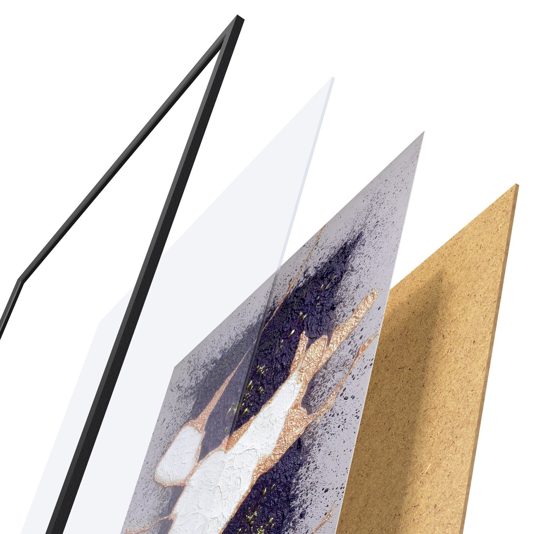 De poster bestaat uit een frame, plexiglas, geprinte afbeelding en spaanplaat achterkant. De poster kan meteen aan de muur worden gehangen dankzij de bevestigingen op de achterkant.