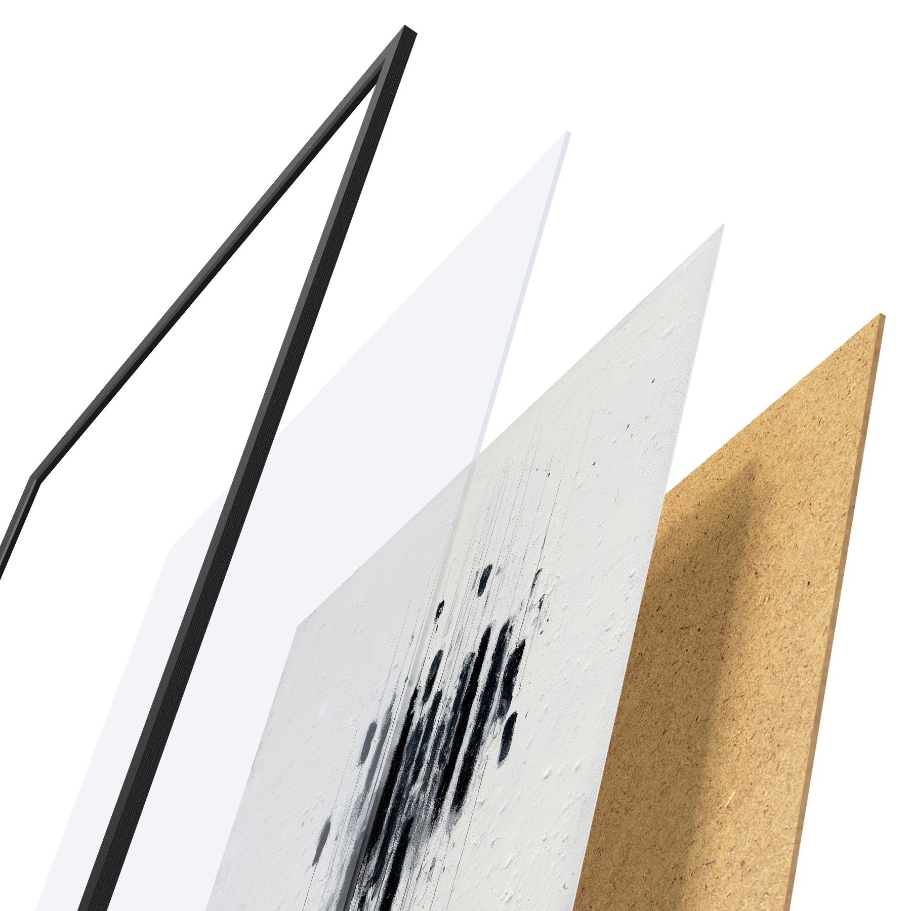 De poster bestaat uit een frame, plexiglas, geprinte afbeelding en spaanplaat achterkant. De poster kan meteen aan de muur worden gehangen dankzij de bevestigingen op de achterkant.