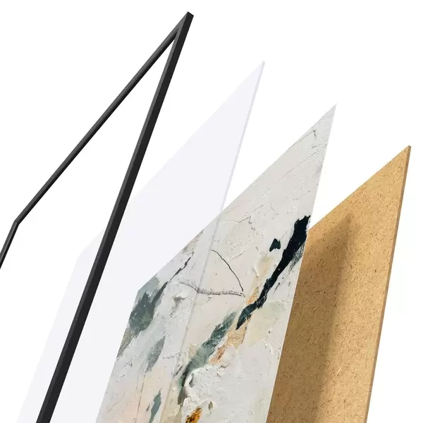 De poster bestaat uit een frame, plexiglas, geprinte afbeelding en spaanplaat achterkant. De poster kan meteen aan de muur worden gehangen dankzij de bevestigingen op de achterkant.