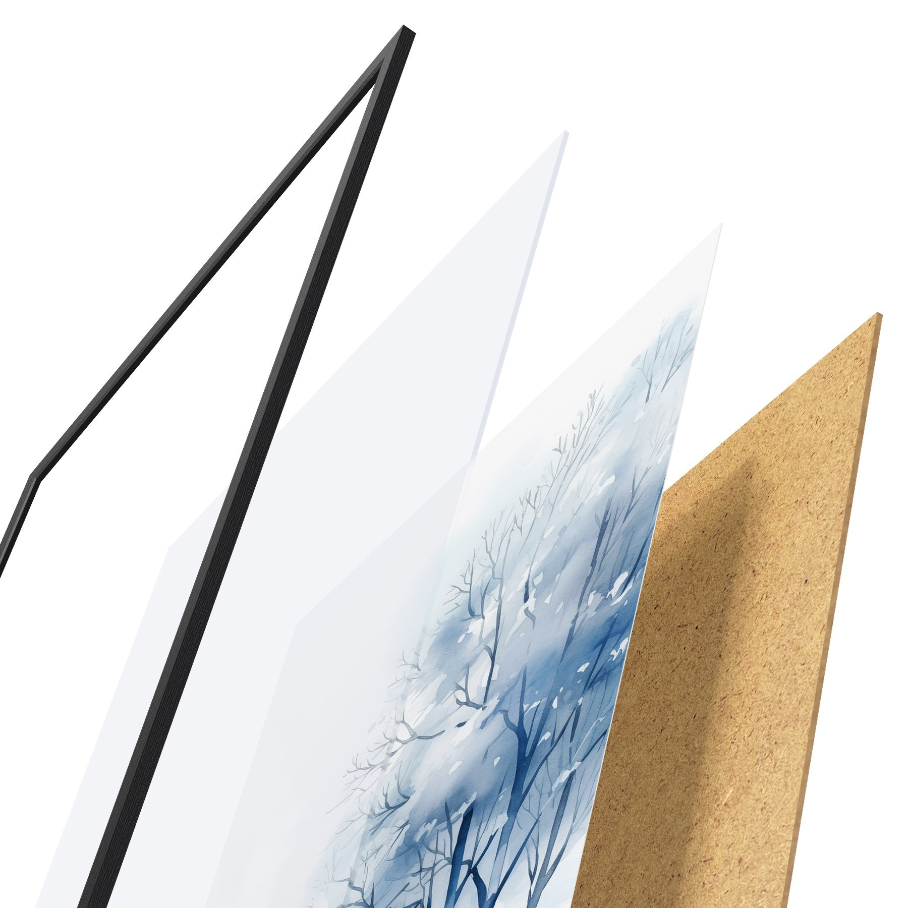 De poster bestaat uit een frame, plexiglas, geprinte afbeelding en spaanplaat achterkant. De poster kan meteen aan de muur worden gehangen dankzij de bevestigingen op de achterkant.