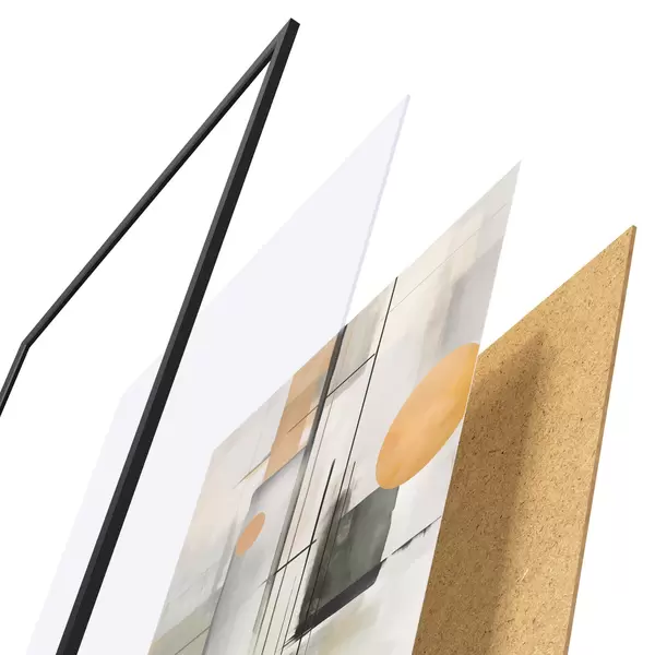 De poster bestaat uit een frame, plexiglas, geprinte afbeelding en spaanplaat achterkant. De poster kan meteen aan de muur worden gehangen dankzij de bevestigingen op de achterkant.