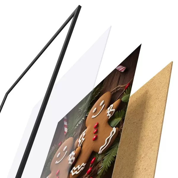De poster bestaat uit een frame, plexiglas, geprinte afbeelding en spaanplaat achterkant. De poster kan meteen aan de muur worden gehangen dankzij de bevestigingen op de achterkant.