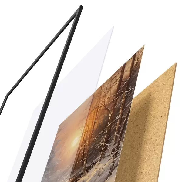 De poster bestaat uit een frame, plexiglas, geprinte afbeelding en spaanplaat achterkant. De poster kan meteen aan de muur worden gehangen dankzij de bevestigingen op de achterkant.