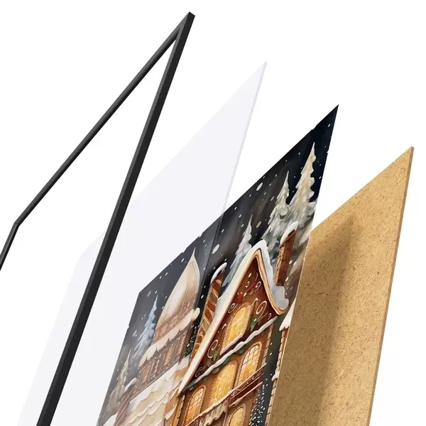 De poster bestaat uit een frame, plexiglas, geprinte afbeelding en spaanplaat achterkant. De poster kan meteen aan de muur worden gehangen dankzij de bevestigingen op de achterkant.