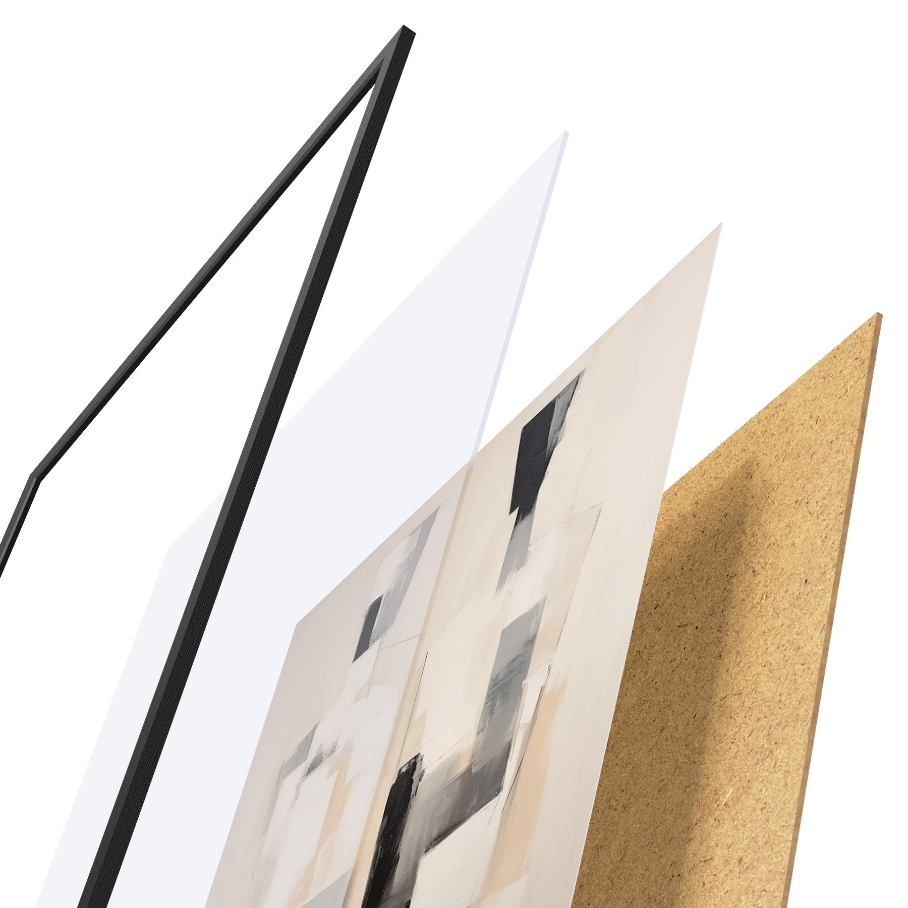 De poster bestaat uit een frame, plexiglas, geprinte afbeelding en spaanplaat achterkant. De poster kan meteen aan de muur worden gehangen dankzij de bevestigingen op de achterkant.