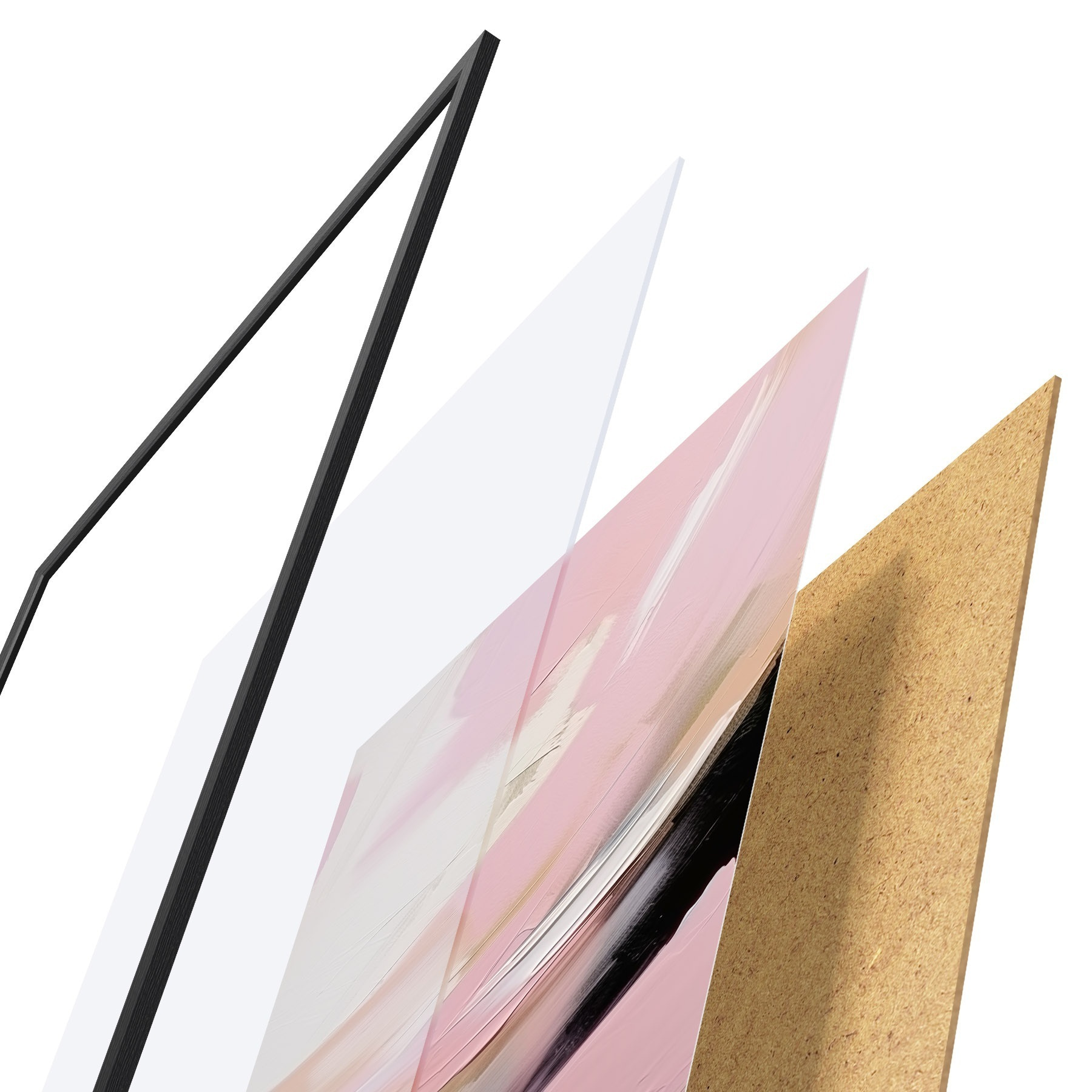 De poster bestaat uit een frame, plexiglas, geprinte afbeelding en spaanplaat achterkant. De poster kan meteen aan de muur worden gehangen dankzij de bevestigingen op de achterkant.